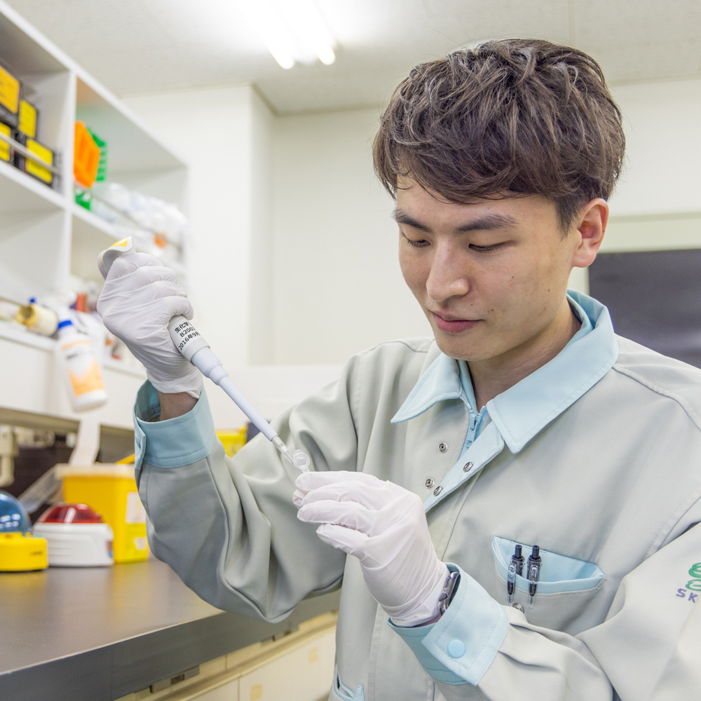 三和化学研究所の研究職は少数精鋭でテーマに関わるのが特長です。新規テーマや試験内容の立案から実際の実験業務まで、責任をもって取り組むことや論理的な思考が求められ、時には自分の専門分野の薬理だけでなく薬物動態や毒性に関係する知識が求められることもあるので苦労することも多々あります。しかし、社員同士の距離が近く人柄が良い社員が多いのも三和化学研究所の特長。行き詰った時や悩んだ時にはたくさんの先輩や上司がアドバイスをくれたり相談に乗ってくれます。実験をして良い結果が得られた時やテーマが前進した時にはホッとするのと同時にものすごいやりがいを感じることができます。若手のうちからプロジェクトリーダーを任され他グループの研究者たちをまとめる経験を積めるのも三和化学研究所の魅力だと思います。