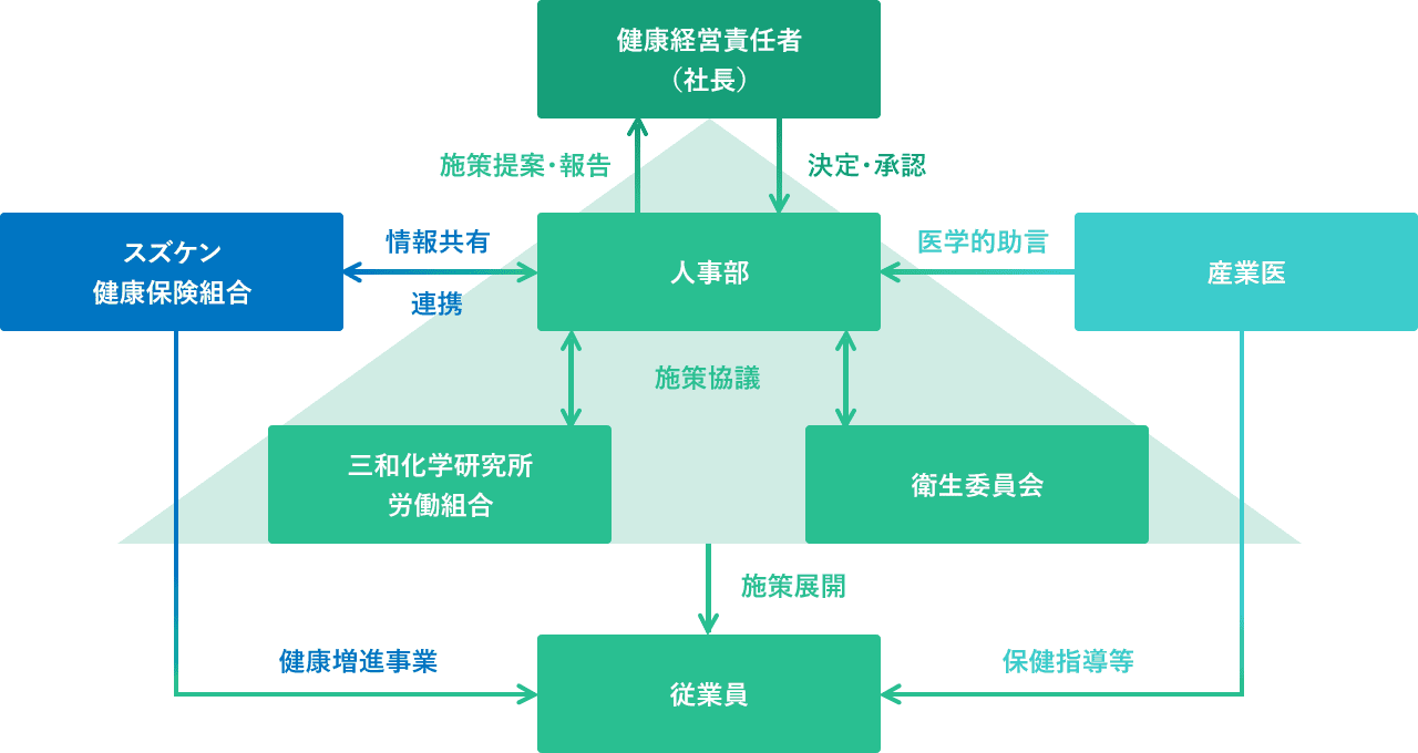 私たちは、「Design Your Smile 健康創造のスズケングループ」をスズケングループコーポレートメッセージと定め、健康を願う皆さまに、新しい価値を持った“くすり”を創出しお届けすることを使命としています。 この使命を実現するためには、全従業員の「からだ」と「こころ」が健康で、かつ自分の能力を最大限に発揮できる環境であることが必要不可欠です。そして、従業員だけではなく、そのご家族の皆さまにおいても、いきいきと明るく健やかでいることが大切です。 私たち三和化学研究所は、全従業員とご家族の皆さまの健康維持・増進に向けた取り組みを推進し、当社使命を達成していくことを宣言いたします。