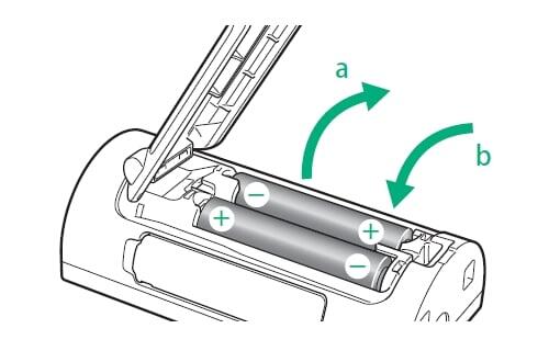 古い電池を取り出し(a)、新しい電池を入れます(b)。
