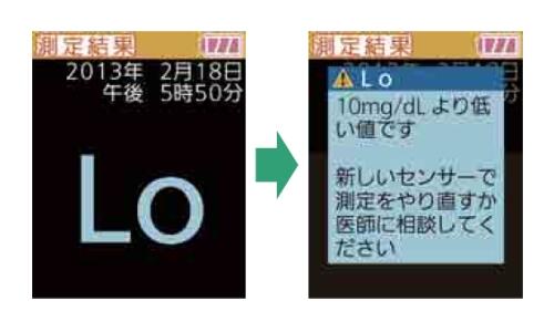 血糖値が 10 mg/dL 未満のとき「Lo」が表示されます。測定結果に疑問を感じた場合には、再度測定を行ってください。