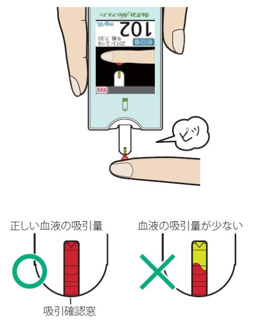 次に、グルテストNeoセンサーの吸引確認窓の全面が赤くなるまで十分に吸引します。原因②