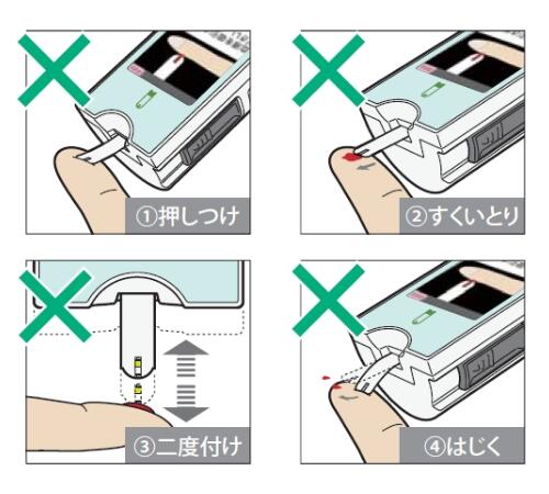 - グルテストNeoセンサーの先端に血液を接触させるときは、正しい方法で行ってください(Q.血液をセンサーに接触させても測定が開始されません 参照)。