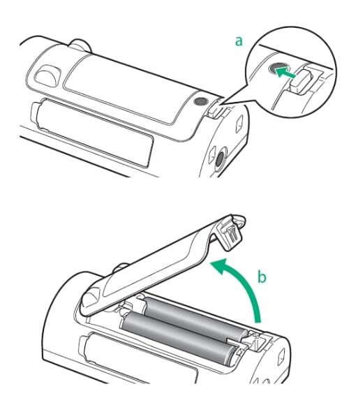 古い電池を取り出し(a)、新しい電池を入れます(b)。