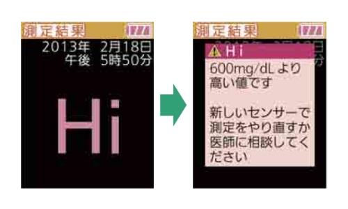 血糖値が600 mg/dL を超えたとき「Hi」が表示されます。測定結果に疑問を感じた場合には、再度測定を行ってください。